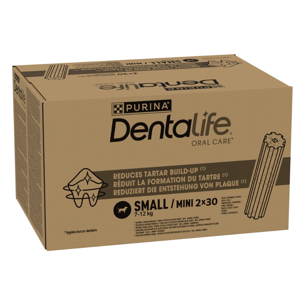 Čištění zubů bez kartáčku – jak je to možné? Zcela jednoduše: Dentalife Small pamlsky pro malé psy čistí zuby Vašeho čtyřnohého přítele během žvýkání. K tomu přispívá speciální porézní textura pamlsků pro péči o zuby, který podporuje odírání zubů. K tomu se přidává speciální tvar tyčinek, díky kterému lze čistit také těžko dosažitelná místa (jako např. zadní zuby). Tyto žvýkací pamlsky pro psy obsahují vitamin D a vápník, což jsou látky, které jsou důležité pro zachování zdravých zubů. Pamlsky samozřejmě neobsahují přidaný cukr. Dentalife Small pamlsky pro malé psy nejenže sníží riziko tvorby zubního plaku a kamene, ale mohou také přispět ke svěžímu dechu Vašeho psa. Dentalife Small pamlsky pro malé psy v přehledu: Doplňkové krmivo pro dospělé psy malých plemen od 7 do 12 kg Ideální pro každodenní péči o zuby: čištění zubů díky mechanickému odírání při žvýkání, může snížit riziko vzniku zubního kamene a podpořit svěží dech Porézní struktura a speciální tvar: při žvýkání se dostane také k těžko dosažitelným místům, jako jsou např. stoličky S vitamínem D a vápníkem: může přispět k zachování zdravých zubů S drážkami: pro jemnou masáž okraje dásní přírodní pamlsek: bez umělých aromat a barviv Bez přidaného cukru Velmi chutné: velmi dobrá akceptace u mnoha psů